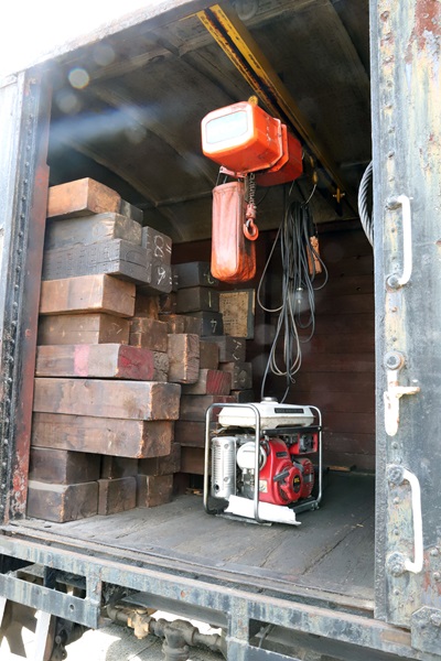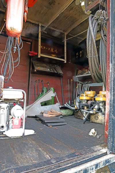 ▲ワ1内部の反対側には発電機や油圧式ジャッキ、脱線復旧器、牽引用ワイヤー、スコップ、大型スパナなどが積まれる。脱線復旧器は鉄道模型のリレーラ―のようなもので、軽度な脱線ではこれを車輪の下に挟み込み、機関車で脱線した車両を引っ張り線路に戻すというもの。