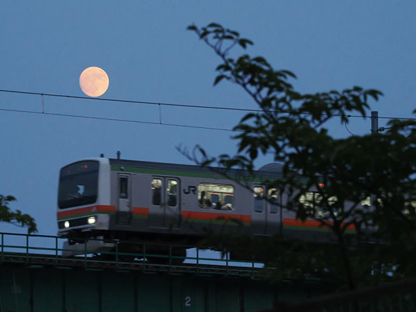 ●月に見送られて、薄暮の鉄橋を渡って行きました。