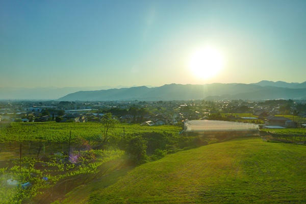 ▲初夏の夕暮れ時の車窓。遠く甲府盆地を見晴らせる。