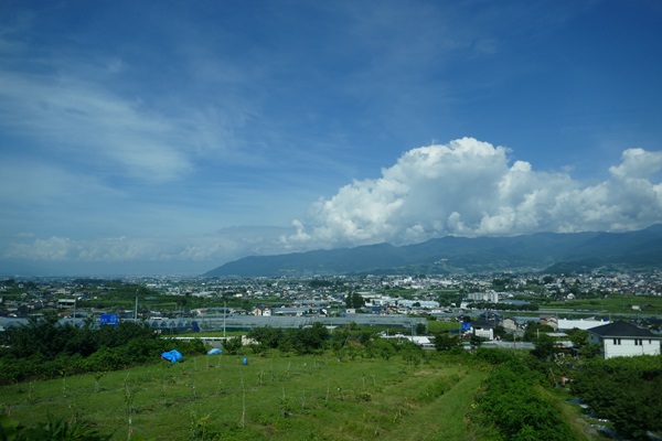 勝沼ぶどう郷駅から北に500mほど進み、市道をくぐると第一のシャッターチャンスがやってきます。ここでは眼下には畑と果樹園が広がり、その先に甲府盆地、遠くには南アルプスの山々を見ることができます。この区間が最も南アルプスの山並みを綺麗に眺められるところですが、ここではそこまで長い間景色を楽しむことはできません。列車はまもなく、わずかながらトンネルに入ります。そして一瞬トンネルが途切れますが、再びトンネルに入ってしまうので、ここでは無理にシャッターを切ろうとしない方がよいでしょう。