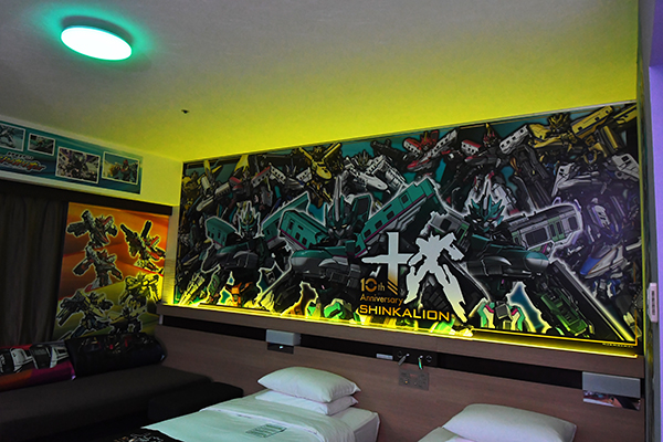 お部屋に入ると壁一面に「シンカリオン」のグラフィックがデザインされており、世界観が部屋の中に再現されます。ここまで派手な装飾を持ったコンセプトルームというのも稀で、壁だけではなくベッドカバーからクッション、バスルームからトイレに至るまで、ありとあらゆる場所に「シンカリオン」の要素があしらわれており、非日常を体感することができます。