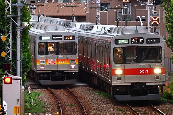 ●東急9000系で3編成目に赤帯に戻った9013F、従来のグラデーション帯の9007Fとすれ違います。