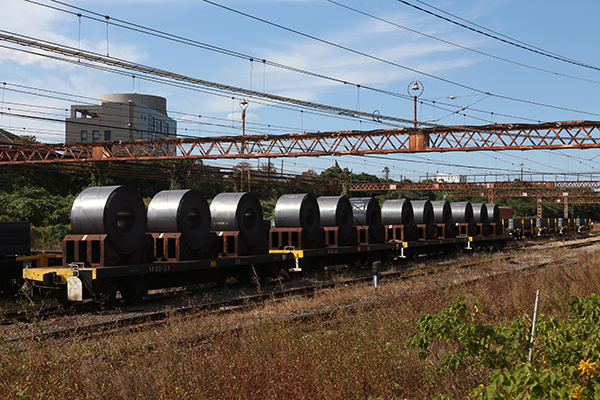6 長物車に積載されたコイル製品。雨天時はカバーがかけられることもあるそう。 【この画像の記事に戻る】 日本でひときわ撮影難易度の高い鉄道かも!?知られざる製鉄所鉄道「くろがね線」を見に行こう! 前の画像 次の画像