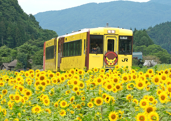 ●咲き始めたひまわり畑を「ポケモントレイン」が、ゆっくりと通り過ぎて行きました。