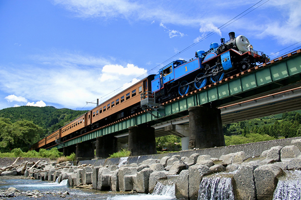 ●川の辺りで上を見上げると青空と青い「トーマス」が目に映りました。