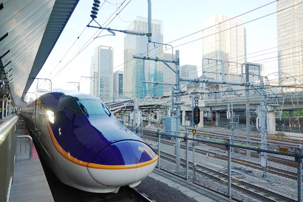 ▲丸の内のビル群を背に出発を待つE8系つばさ。1時間後には自然の中を300km/hで駆け抜けている。