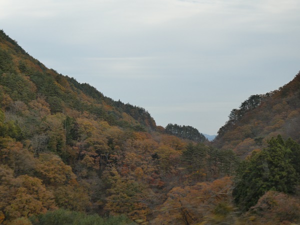 板谷峠より福島盆地方を見る 紅葉の板谷峠。谷の向こうに福島盆地の東縁の稜線がかすかに見える。 【この画像の記事に戻る】 四季折々楽しめる 峠越えのほんの一瞬に広がる絶景!山形新幹線「つばさ」で見晴らす福島盆地の車窓旅 前の画像 次の画像
