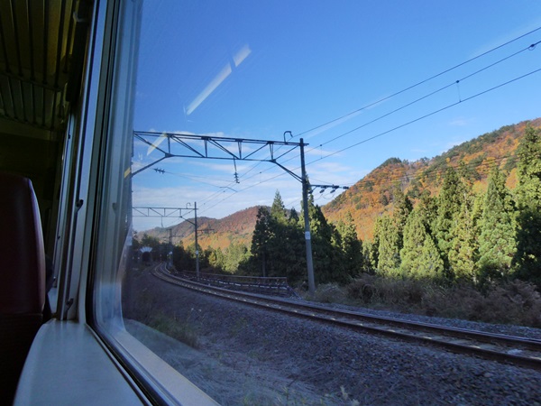 紅葉真っ盛りの板谷峠。福島盆地を見晴らした後にもまだ麗景が待っているのがこの区間の魅力。