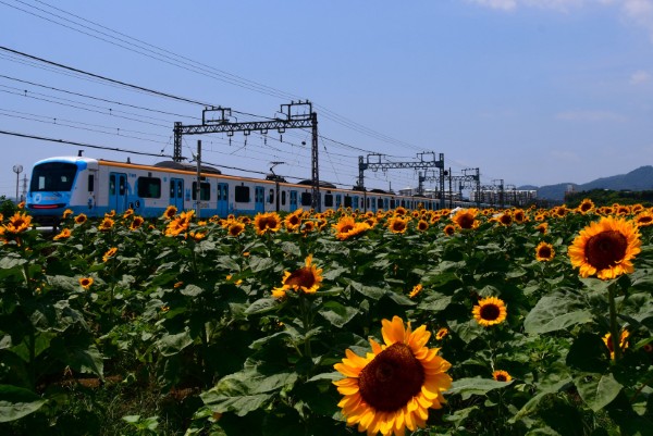 39℃の灼熱で満開の向日葵も少しお疲れ気味。そんな向日葵を励ますように「もころん号」がやってきました。