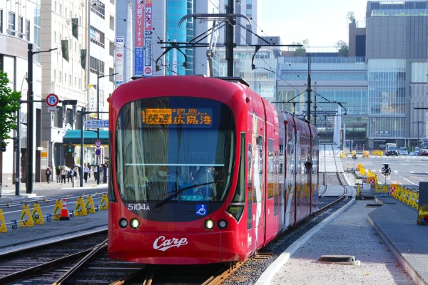 駅前大橋ルート開業と同時に始まった快速運転。今日はカープラッピングの編成がその任にあたりました。
