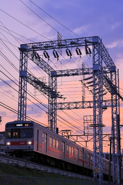 送電線が東急多摩川線をクロスするところ、いかつい鉄塔が夕空に浮かびます。