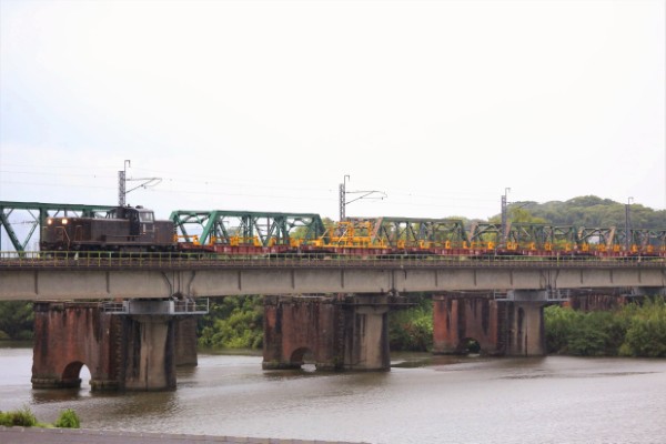 ●篠栗線のレール工臨を終えたDE10が、雨の遠賀川を渡って帰って来た。