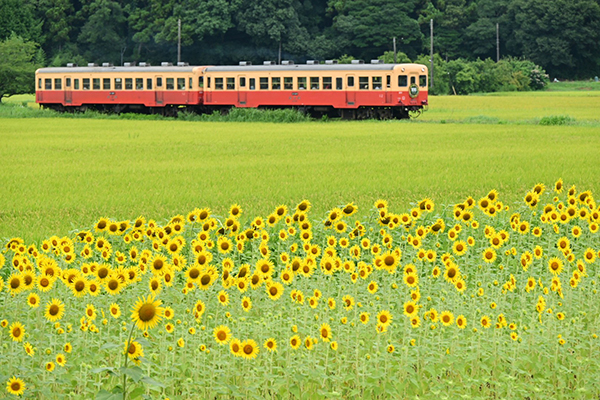 ●緑の絨毯のような田んぼとひまわり。古豪が走ってきました。