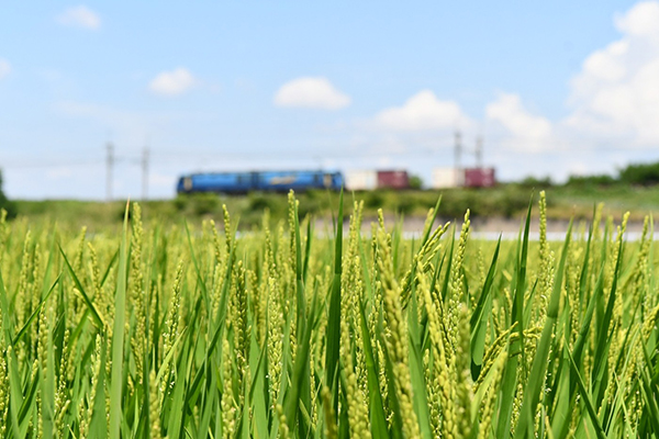 ●東線貨物2083レ EH200-9号機が牽くコンテナ貨物を、出穂した稲を取り込んでの撮影です