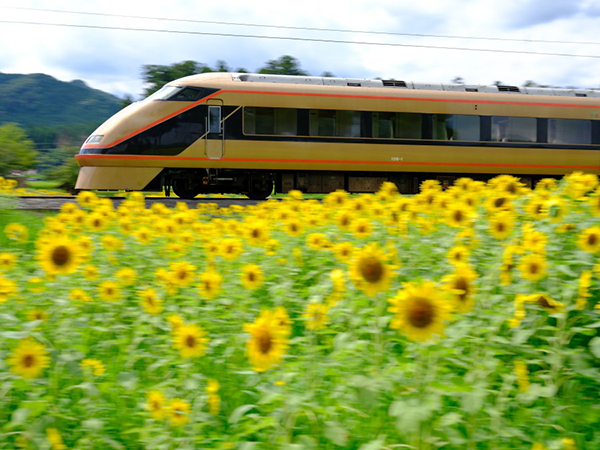 ●倉ヶ崎の満開のひまわり畑の中を行く「スペーシア」を流し撮りで撮影。