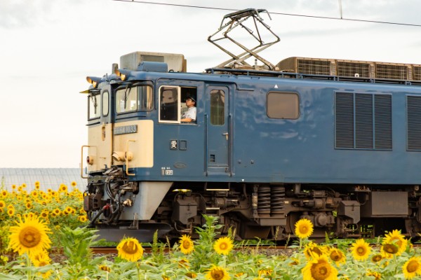 ●朝のひまわり畑に現れたヒゲ面の機関車。