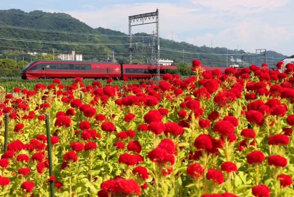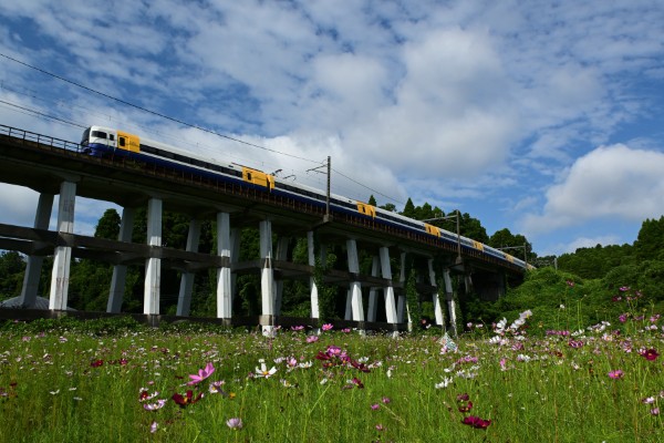 ●日本古来からの「ハマカンゾウ」が咲き誇る橋梁を駆け抜ける、オレンジ色の花にも負けないカラーの「SDGsトレイン」。