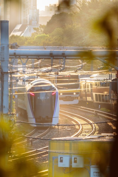 ●蝉の鳴き声が響く夕方の神田川沿い。木々の隙間から見えた複々線は、お盆休みの行楽客を乗せた列車がひっきりなしに通過していました。