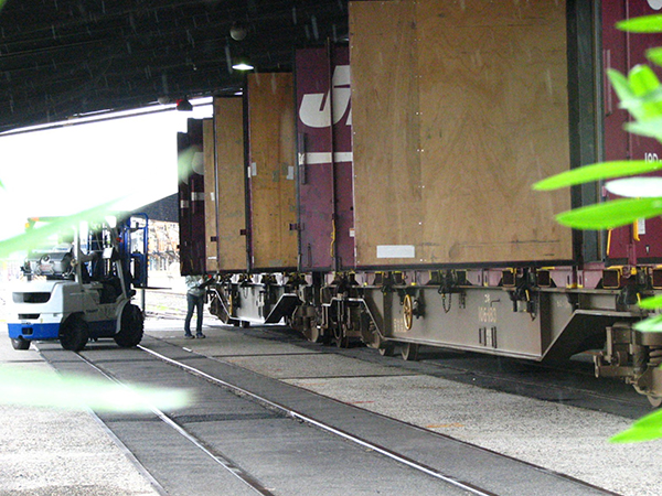 屋根付きのプラットホームで荷役を行う光景が新鮮。