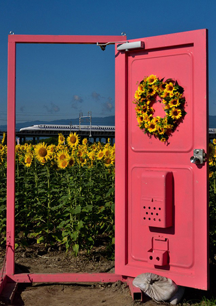 ●青々とした稲が風に揺れ、その向こう、強い日差しを浴びる高架を走るミャクミャクカラー。