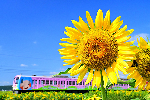 ●青空に咲く大輪とピンク色の電車が、真夏の鮮やかな風景を演出してくれました。