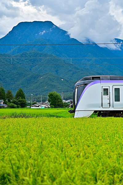 雄大な有明山、実った稲穂を眺めて、特急「白馬」号が駆け抜けてゆきます