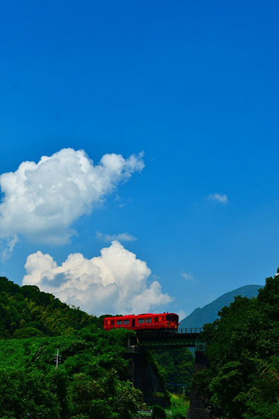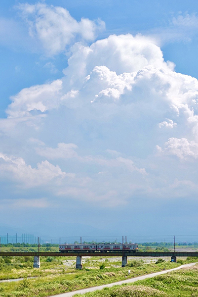 ●大きく盛り上がる夏雲の下、元東急車両が橋梁を渡っていきました。