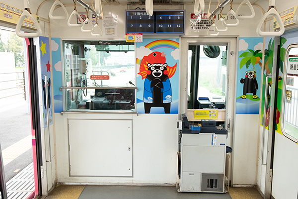 運転台にもくまモンラッピングが。観光客も多く訪れており、おもてなしの意味もありそうだ。