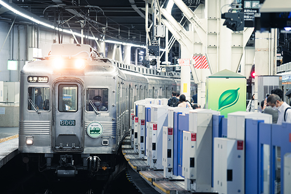古参の6000系がホームドアが設置された現代の難波駅に入線する。時空を超えた共演が楽しめるのも今のうち。