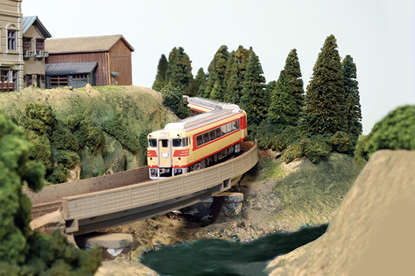 mente-053-N 私鉄からの直通特急は、スイッチバックの駅で折り返し、観光客から人気の渓谷沿いを走って目的地へと急ぐ。 【この画像の記事に戻る】 ホコリをかぶってしまった鉄道模型レイアウトを土日でリフレッシュ!ジオラマとレールのお掃除をやろう! 前の画像 次の画像