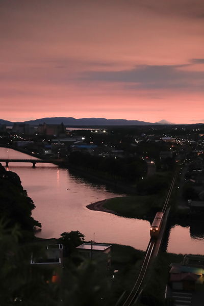 ●川面が残照に染まる頃、鉄橋を渡る音が聞こえてきました。