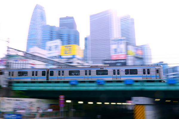 ●新宿の高層ビル群をバックにりんかい線車両が駆け抜ける。