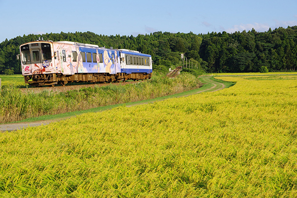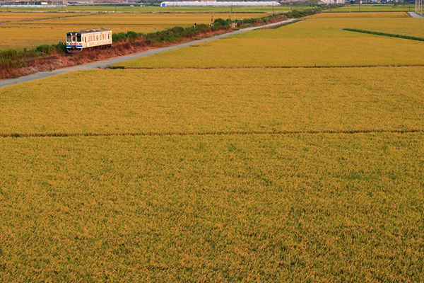 ●黄金色の絨毯にポツンと単行ディーゼルカー。