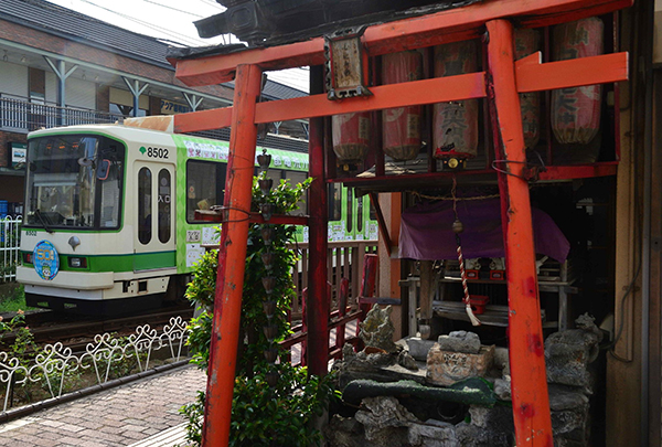 ● 「50周年号」とちいさなお宮。荒川線をずっと見守ってきたようです。