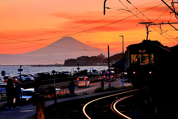 ダイヤモンド富士から約30分、綺麗に焼けた七里ヶ浜を背景にカーブを通過したレトロ調江ノ電20形。