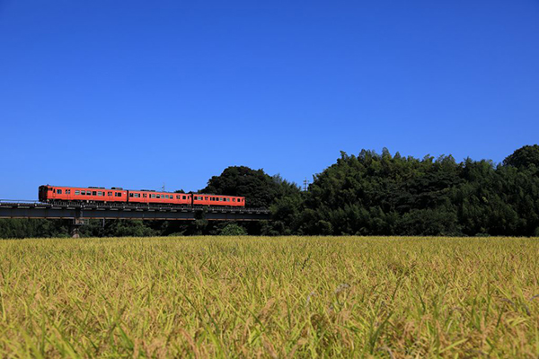 快晴の青空の下、黄金色に染まる稲田をたらこ色の国鉄型キハが通過して行きました。
