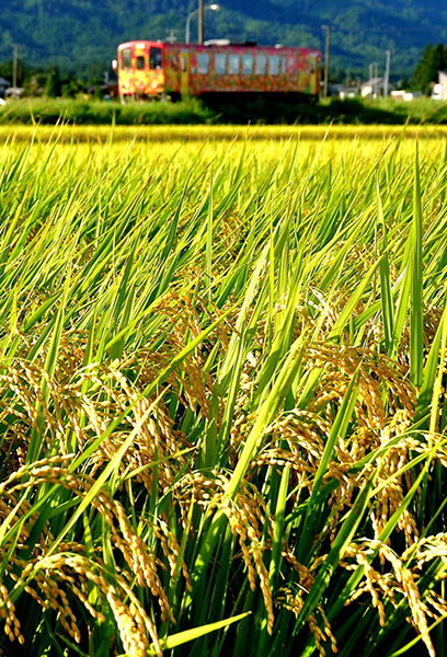 ●黄金色に稔った稲と、はさ掛け。日本の秋の景色の中を行くキハ40。