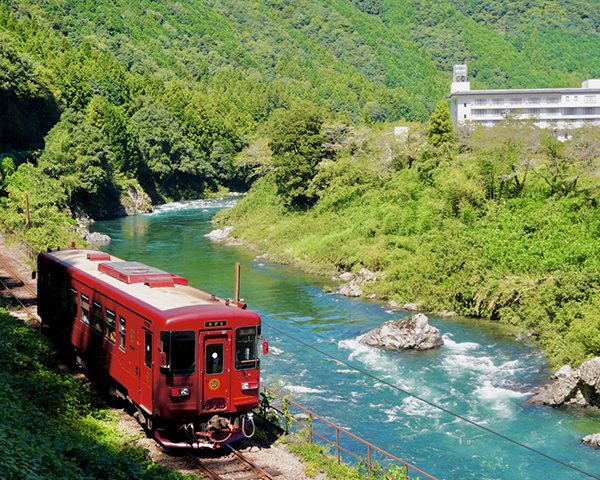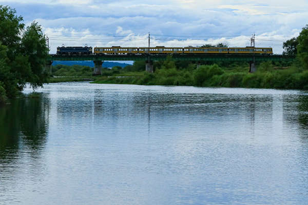 ●美しい長良川の清流を望み、観光列車「ながら」が行きます。