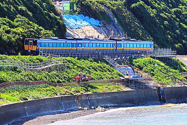 ●昨年の11月に斜面の地盤が緩み線路がゆがんでしまいました。今は徐行しながら列車が走りますが、まだ完全に修復しておりませんので、資材の輸送にはモノレールが欠かせません。