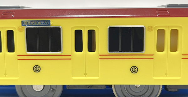 ラッピングはプラレール用にデフォルメされているが、各種ロゴは健在。窓枠の塗装に注目。