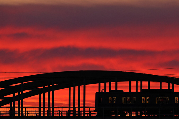 紅く染まった夕空と道路のアーチをバックに、小田急線のシルエットが印象的でした。