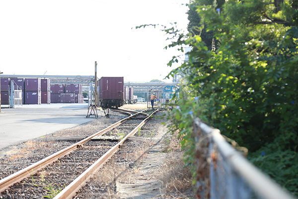 列車の組成が完了し、9時前ごろになると列車が遮断機のない踏切をゆっくりと横断していきます。遮断機がないため踏切手前でいったん停止して、係員の誘導に合わせてゆっくり長編成のコキ車が横断する光景は、まさに専用線観察の醍醐味といえるでしょう。