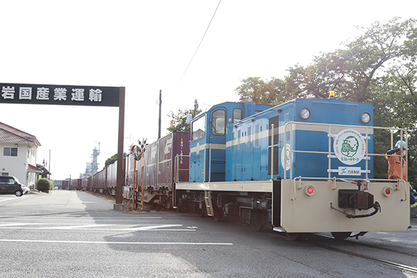 帰りは着便の貨車を工場内に引き上げるため、行きと同じく幹線道路を長い貨車が横断する光景を見ることができます。また、工場内は専用線を横切る形で構内道路が設けられている関係か、編成を複数に分割する必要があるため遠目にその光景を見ることも可能です。