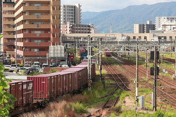 「HD300が先に貨車を引き上げたのち、入換機が専用線へ貨車を引き込む。入換の様子は国道2号線の山陽本線との交差部から観察することができる。