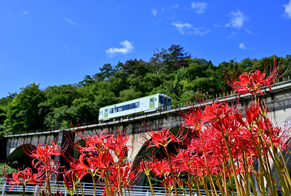 ●めがね橋に咲く彼岸花と「気動車」がコラボしました。