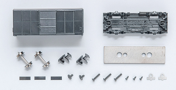 まずは車両の台枠(車体の床の部分)のカプラーポケット(連結器を止めておくポケット)に黒色塩ビ板によるカプラー板バネを差し込みます。続いてそのカプラーポケットにアーノルトカプラーを向きに気を付けて差し込みます。この時、各模型メーカーから発売されている自分のお気に入りのカプラーを差し込むんでも大丈夫です。カプラーポケットの蓋をネジ止めしたら、床上にウエイト(重り)をネジ止めします。これも付属の縁付きネジで止めましょう。