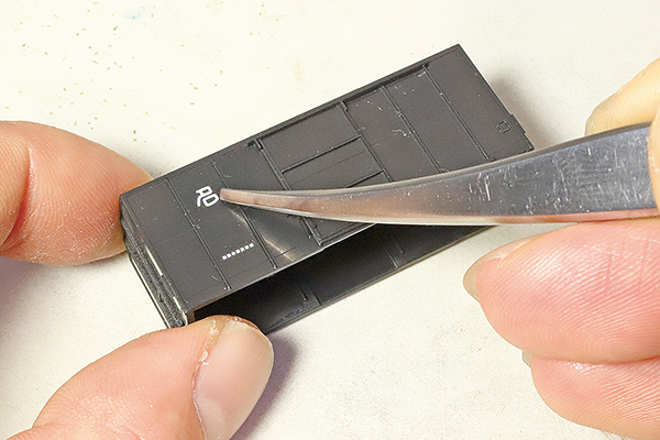 P25-003 説明書に指定された位置を(所属区と車番の関連性も)確認しながらピンセットで貼付。手スリと干渉するデカールは事前に切れ込みを入れるかカットしておくと良い。 【この画像の記事に戻る】 簡単一手間で超リアルに!休日1日で鉄道模型の貨車を組み立て「自分だけの車両」にメイクアップしよう! 前の画像 次の画像