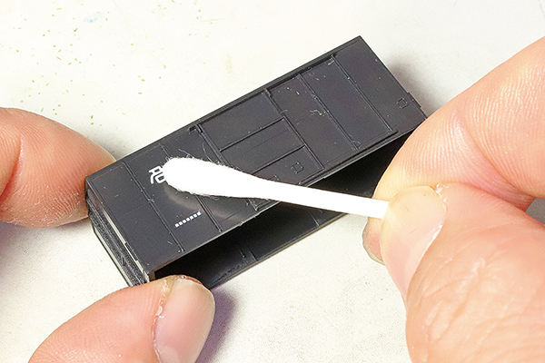 P25-004 綿棒に水、またはデカールソフターをしみこませ、デカール表面を軽くなでるように位置を微調整し、綿棒を転がすように密着させる。 【この画像の記事に戻る】 簡単一手間で超リアルに!休日1日で鉄道模型の貨車を組み立て「自分だけの車両」にメイクアップしよう! 前の画像 次の画像