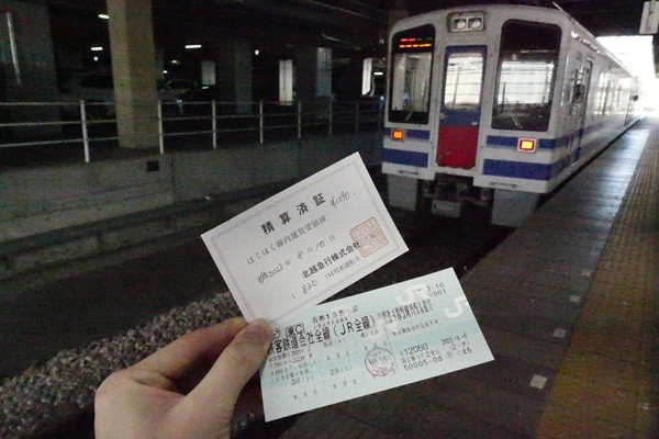 ▲出発を待つほくほく線直江津行き。18きっぷ利用の際は出発前にほくほく線内の運賃を精算する。