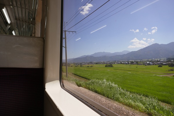 ▲ほくほく線のクロスシートに乗りながら魚沼盆地を眺める。奥は越後山地。